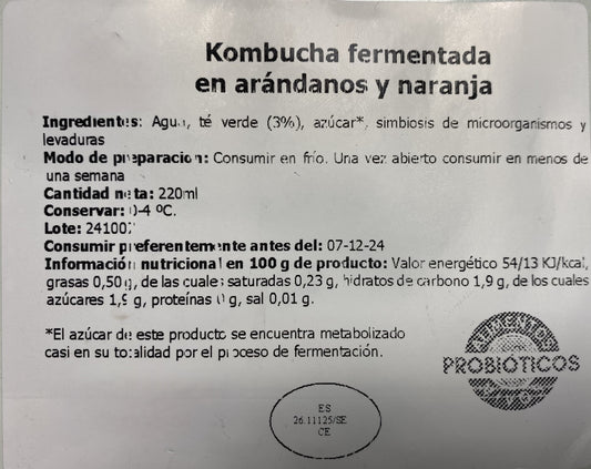 KOMBUCHA ARTESANAL FERMENTADA EN ARÁNDANOS Y NARANJA 220 ml