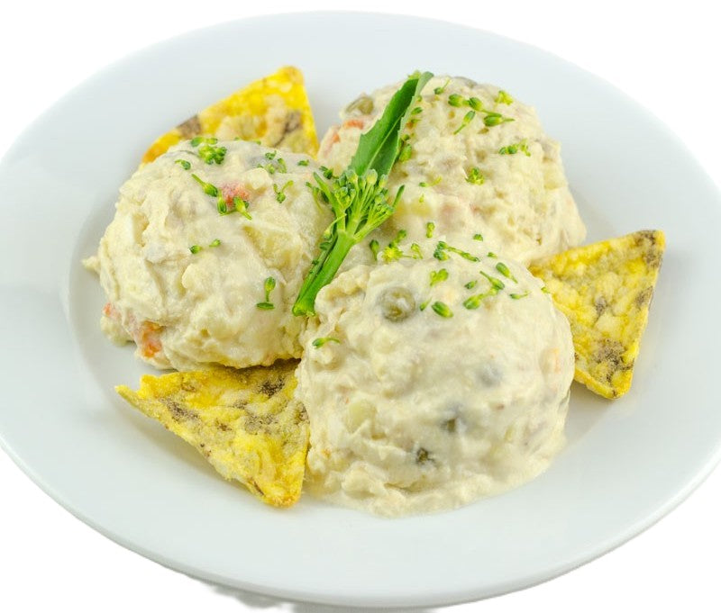 patata 39%, mayonesa (SOJA, HUEVO) 24%, agua de cocción 14%, ATÚN (ATÚN, aceite de girasol) 7%, HUEVO cocido 7%, guisante 5%, zanahoria 5%, sal 0,13%