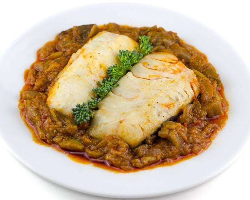 pisto de verduras (calabacín, tomate frito (tomate, manzana, aceite de oliva, sal), berenjena, cebolla, pimientos, aceite de oliva, ajo, sal) 69%, MERLUZA 31%