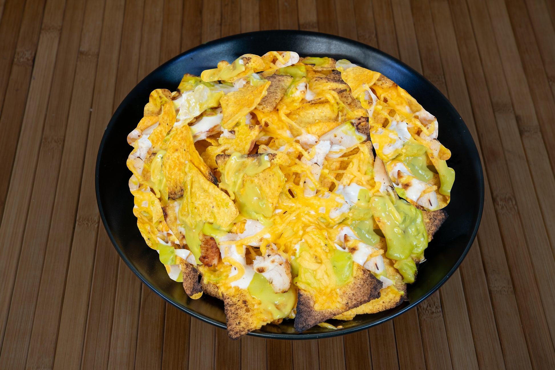 Nachos de maiz con sabor a queso, carne de ternera picada, cheddar fundido, guacamole, salsa de yogurt, jalapeños, y picadillo de tomate y cebolla.