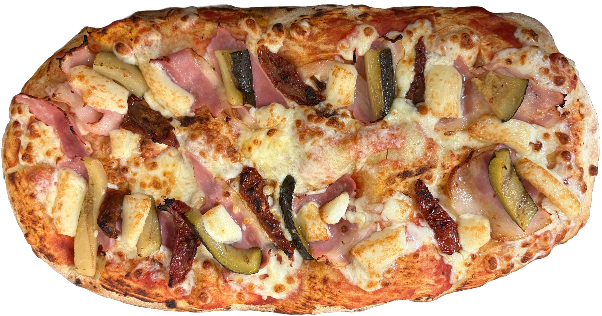 Masa de pinsa, salsa de tomate, mozzarella 100%, bacón lonchas, tomate seco, calabacín, queso de cabra francés y orégano.