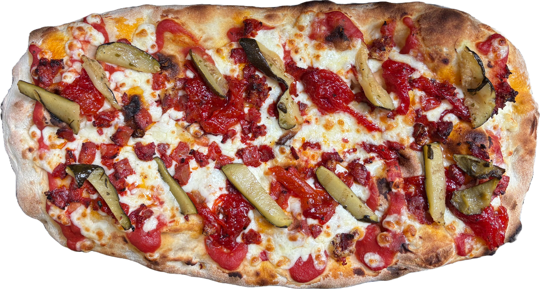 Masa de pinsa, salsa de tomate, mozzarella 100%, chorizo, pimientos rojos caramelizados, calabacín y orégano.