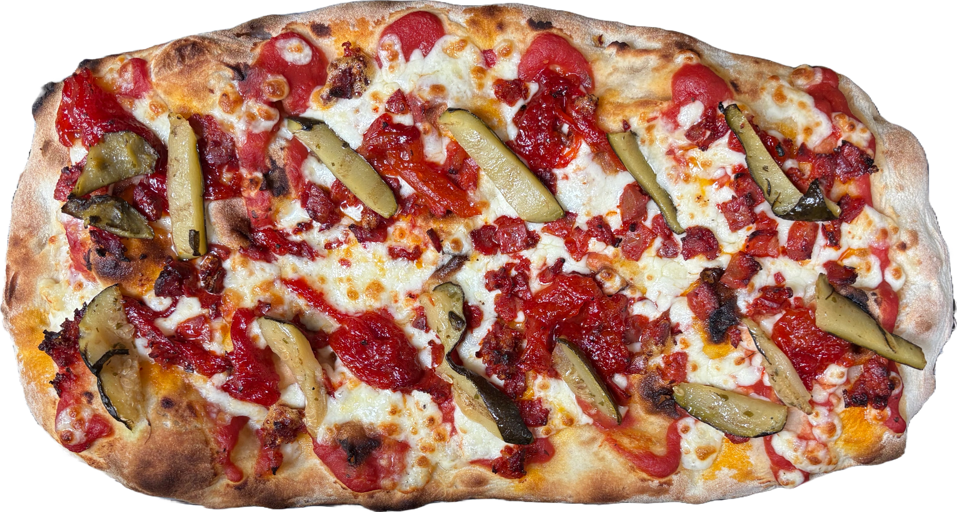 Masa de pinsa, salsa de tomate, mozzarella 100%, chorizo, pimientos rojos caramelizados, calabacín y orégano.