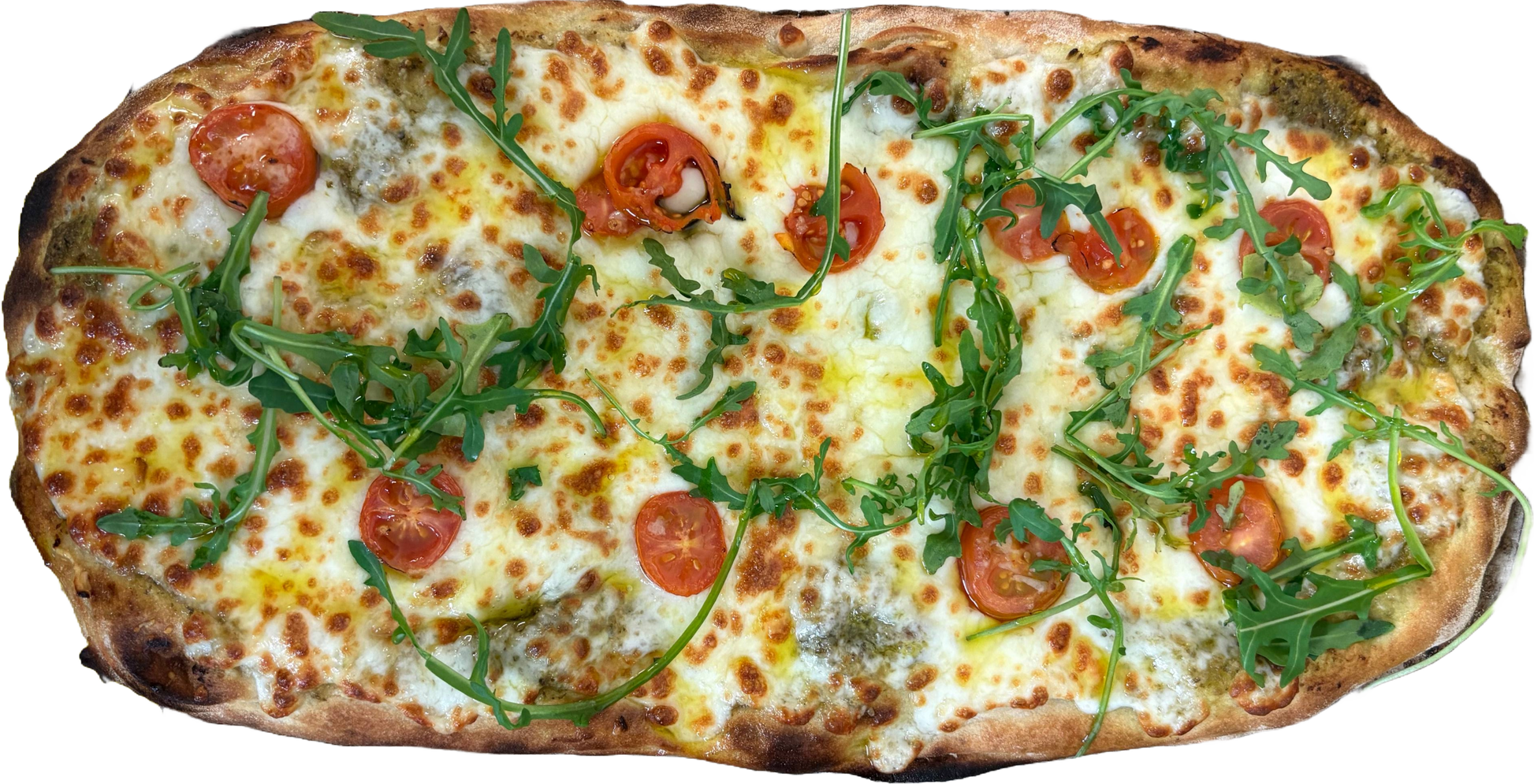 Masa de pinsa, salsa pesto, mozzarella 100%, tomate Cherry, queso parmesano, orégano, rúcula y aceite de oliva virgen extra.