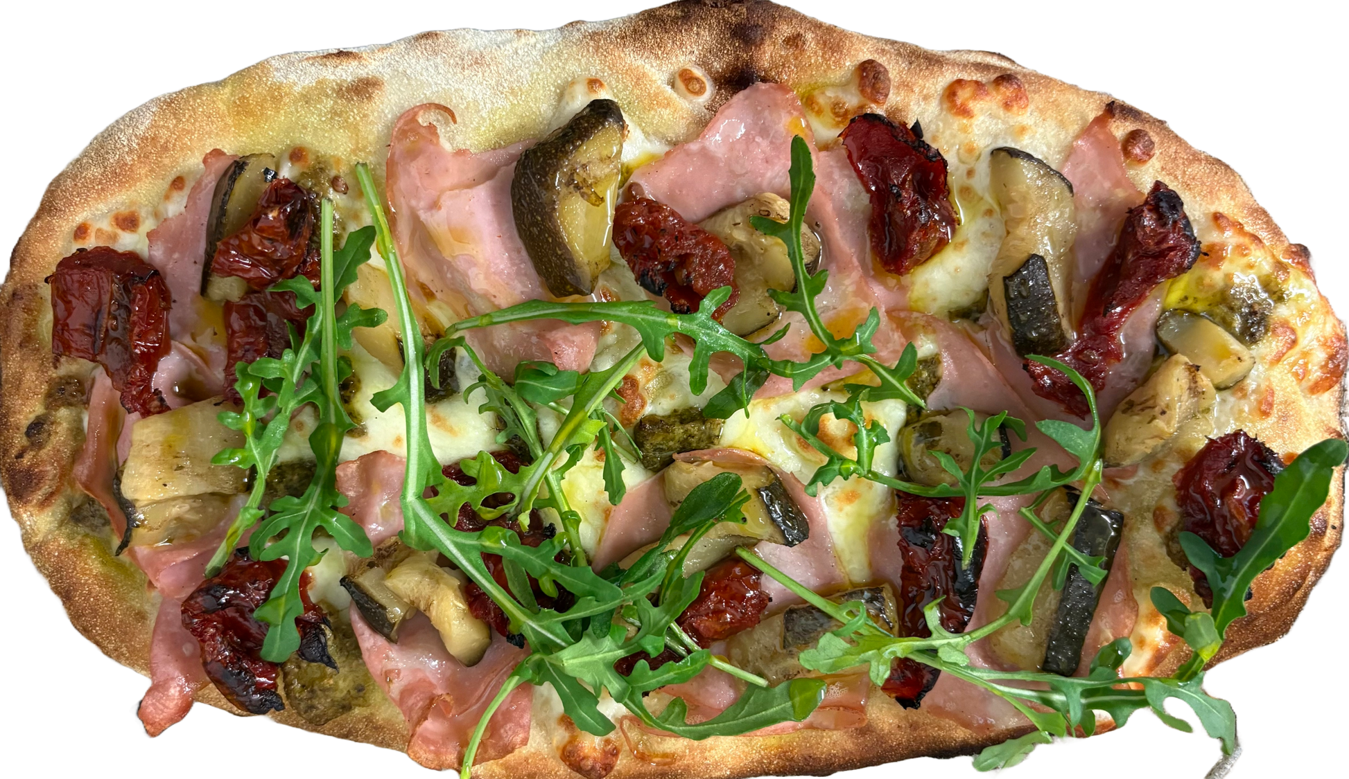 Masa de pinsa con mozzarella, pesto, tomate seco, calabacin, mortadela, rúcula, orégano y aceite de oliva virgen extra.