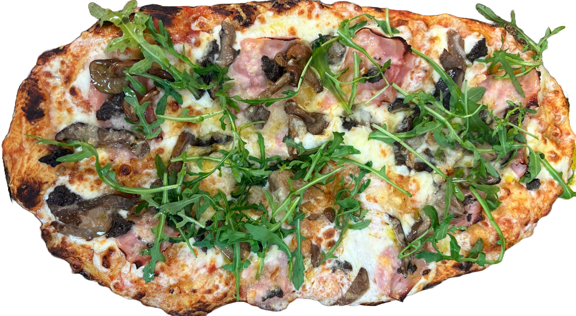 Masa de pinsa, salsa de tomate, mozzarella 100%, jamón york lonchas, crema de trufa, variado de setas gourmet, parmesano rallado, rúcula fresca y aceite de oliva.