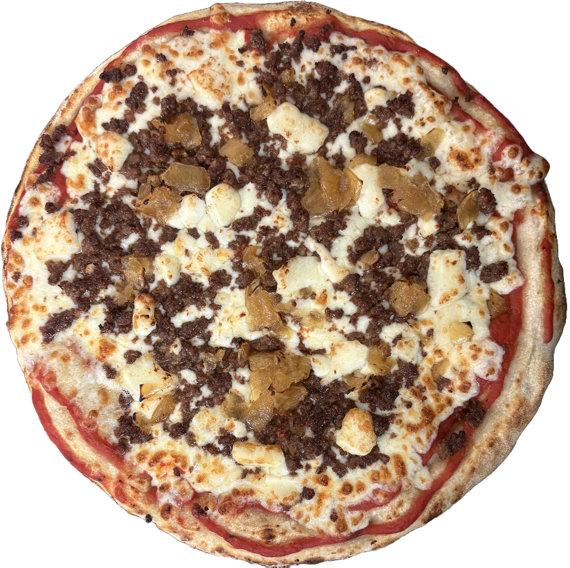 Mozzarella 100%, tomate, carne picada, queso de cabra 100%, cebolla caramelizada y orégano. 33 cm