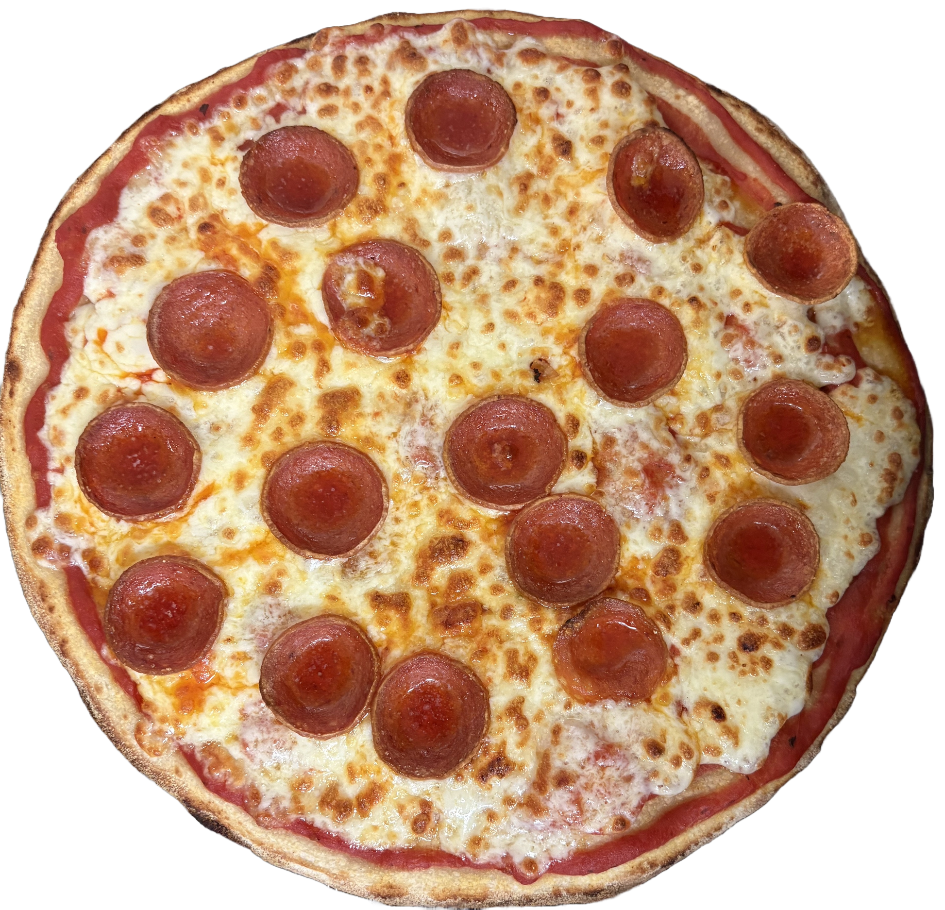 Mozzarella 100%, tomate, pepperoni y orégano. 29 cm Ø