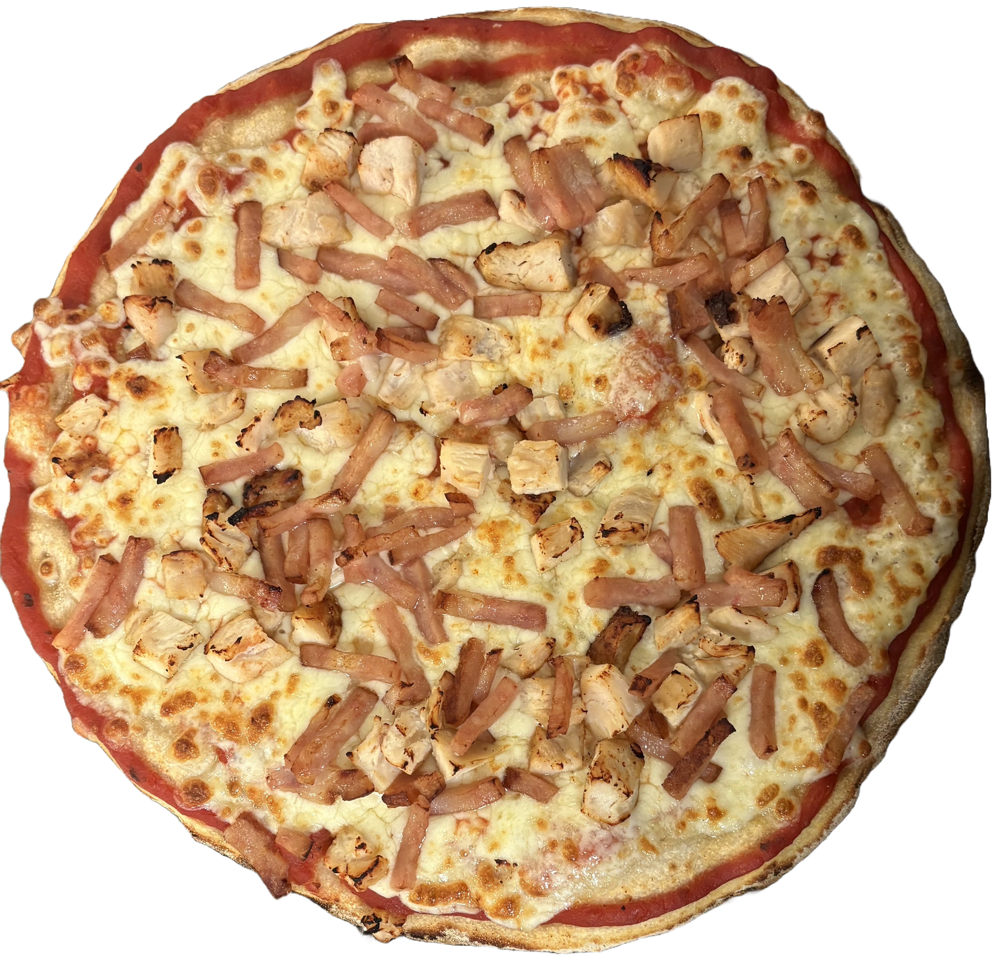 Mozzarella 100%, tomate, daditos de pechuga de pollo y bacón y orégano. 29 cm Ø